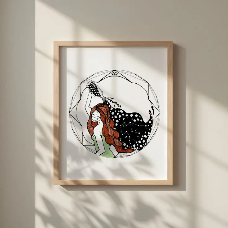 Enmarcado en madera maciza de pino con un perfil limpio y sencillo, encaja de forma natural en distintos espacios. Se entrega listo para colgar y ofrece una manera fresca y personal de conectar con la energía de Acuario en la vida cotidiana: independiente, imaginativa y silenciosamente radical.