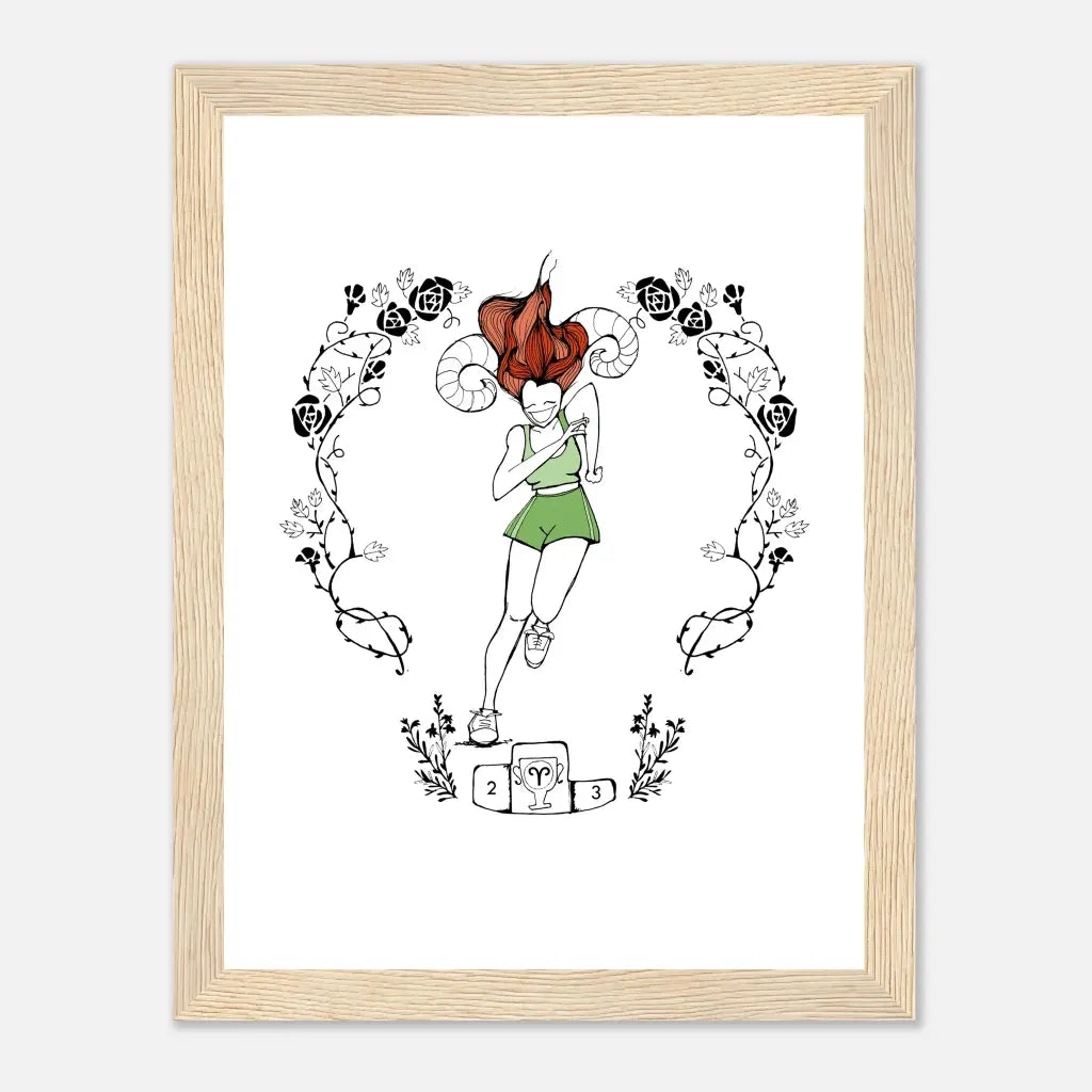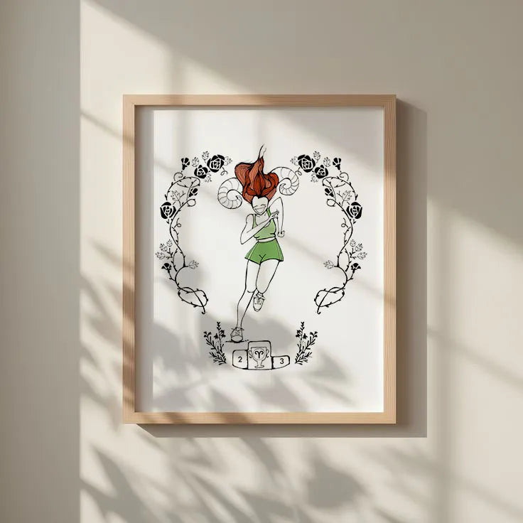 Enmarcado en madera maciza de pino con un perfil limpio y sencillo, se integra con naturalidad en todo tipo de espacios. Se entrega listo para colgar y ofrece una forma suave y personal de conectar con la energía de Aries en la vida cotidiana: presente, intencional y silenciosamente segura.