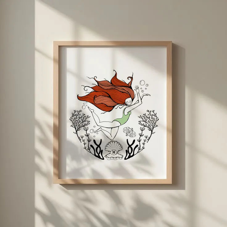 Este póster de Piscis con marco presenta el diseño LoQuiTa Piscis, inspirado en la naturaleza sensible, intuitiva y fluida del signo. Impreso en papel blanco mate de alto gramaje, su superficie lisa y sin reflejos permite que la imagen se despliegue con suavidad, sin ruido visual.
